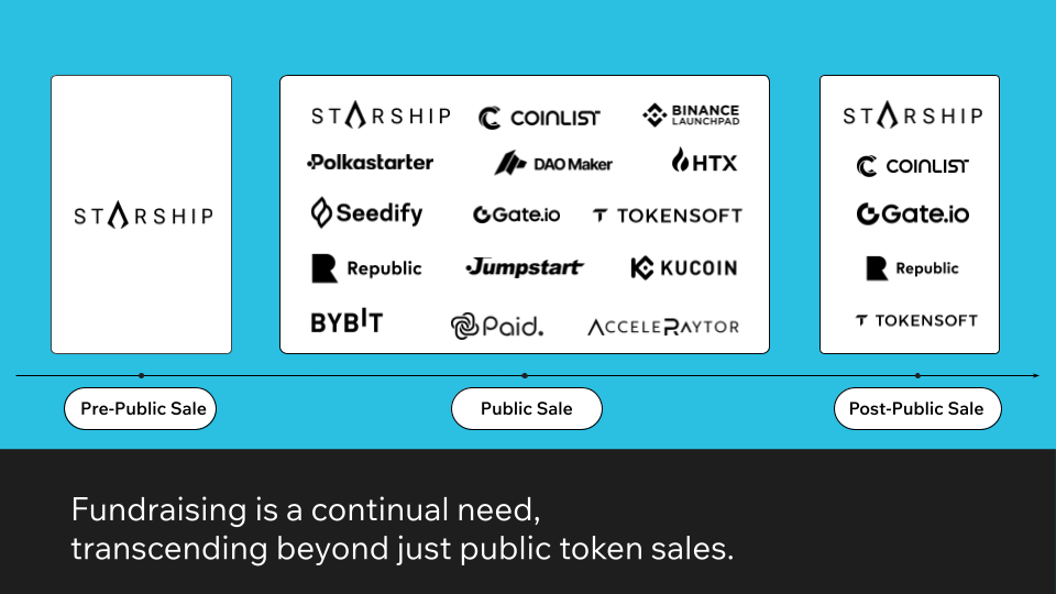 Starship breaks away from the traditional fundraising model, offering a flexible and tailored approach that supports builders at every stage of their project's development. Whether it's pre-public funding to fuel initial development, public token sales to broaden community participation, or post-launch funding to support growth and expansion, Starship provides the resources builders need to succeed at every milestone.